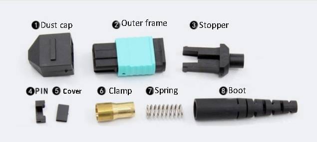 MTP fiber optic connectors have a metal pin clamp inside to hold the push ring. This prevents the loss of the guide pin and concentrates the pressure generated by the spring, preventing the spring from touching and rubbing the fiber during mechanical expansion and contraction, resulting in fiber damage.