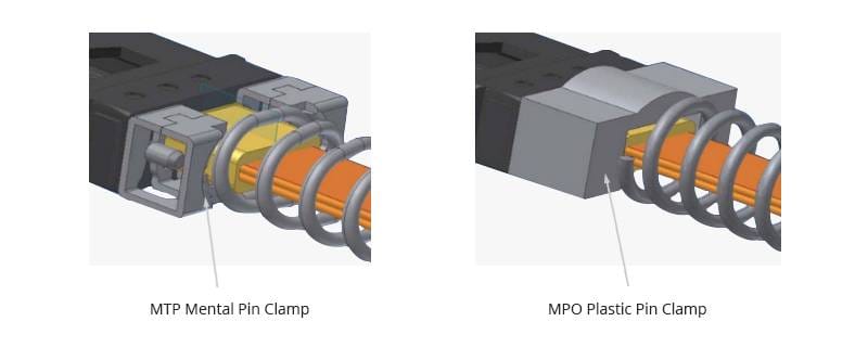 | MTP embedded metal pin clamp and springs ensure proper spring retraction and pressure on the ferrule | MPO plastic pin clamp and spring is elastic and can easily move and damage the fiber optic tape, the spring cross section is not flat. |