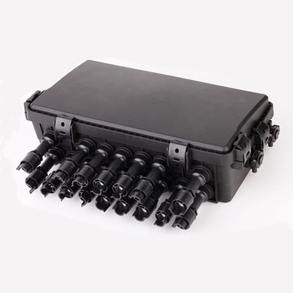 Thix box is a black fiber optic termination box with a robust, rectangular enclosure. Multiple fiber optic ports are arranged at the bottom of the box, enabling organized and secure fiber cable entry. The enclosure is designed to be weather-resistant, making it suitable for both indoor and outdoor deployments, and it protects internal fiber components from environmental damage. The following picture is a close-up of the fiber optic adapters on the termination box. The black adapters feature ceramic ferrules inside, which ensure precise fiber alignment and low-loss optical connections. Their structural design supports stable insertion and removal of fiber optic jumpers.
