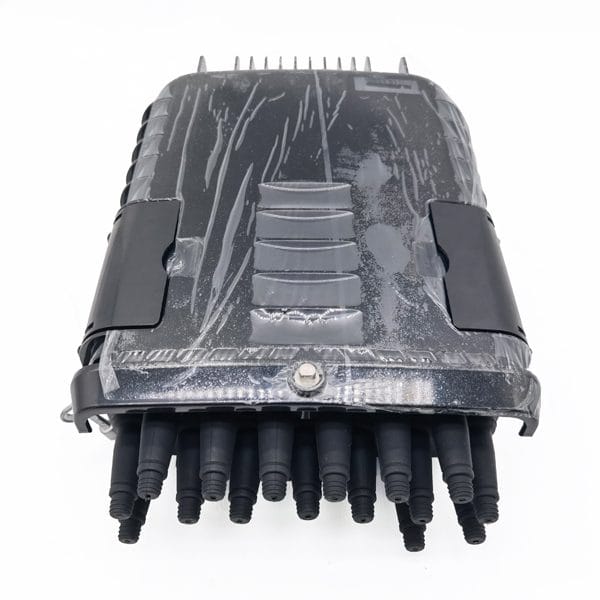 Two metal straps are attached to the box, enabling pole mounting or secure attachment to other structures. The black plastic housing has a ribbed design for enhanced durability and heat dissipation. This compact, robust design makes it suitable for outdoor installations, ensuring the internal fiber optic components are well-protected while facilitating secure mounting.