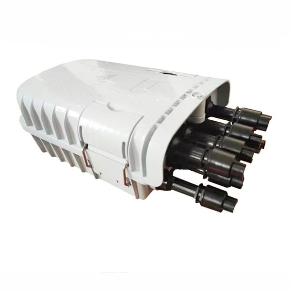 This is an outdoor fiber optic terminal box, mainly grey, which could be also customized in black. It has a rugged, sealed design with a warning triangle symbol (for electrical or optical hazard) on the front. There are two side latches for opening the box, and a small rectangular area that might be for labeling. At the bottom, multiple black fiber optic cable inlets and outlets are visible, indicating it’s built for connecting and managing several fiber cables, with weather-resistant features suitable for outdoor deployment.