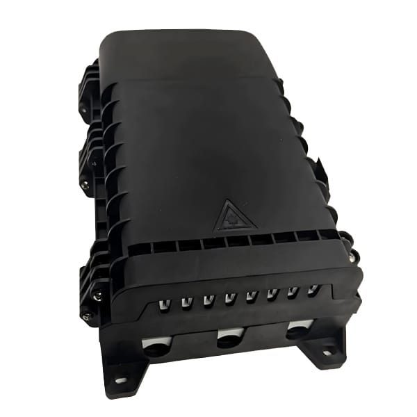 Multiple ports at the bottom/side of the box allow for organized ingress and egress of fiber cables, supporting both drop cables (connecting to end-users) and feeder cables (connecting to the network backbone).