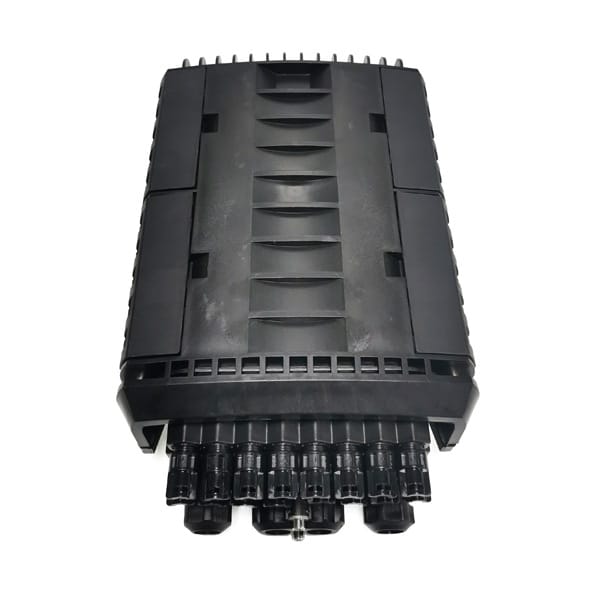At the bottom of the box, there are multiple black cable glands. These glands allow fiber optic cables to enter and exit the box securely. They come in different sizes to accommodate cables of various diameters and ensure a watertight and dustproof seal.