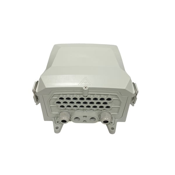 This box has a robust, sealed enclosure with a secure locking mechanism to prevent unauthorized access and ensure IP-rated protection (typically IP65 or higher for dust and water resistance), which could be customized in grey or black. Those multiple ports at the bottom for fiber cables to enter and exit the box, with built-in seals to maintain water resistance.
