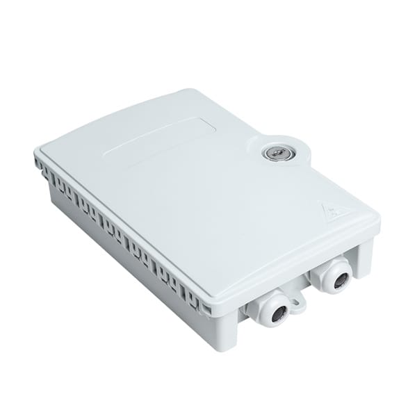 This sealed, hinged box with a secure locking mechanism (visible as a metal lock or latch on the lid) is used to protect internal components from dust, moisture, and physical damage. It is made of durable, weather-resistant plastic (likely ABS or PC) in a light gray/white finish, suitable for both indoor and outdoor installations. And it is also equipped with multiple cable glands (usually two or more) at the bottom or side, allowing for organized ingress and egress of fiber optic cables while maintaining environmental sealing.